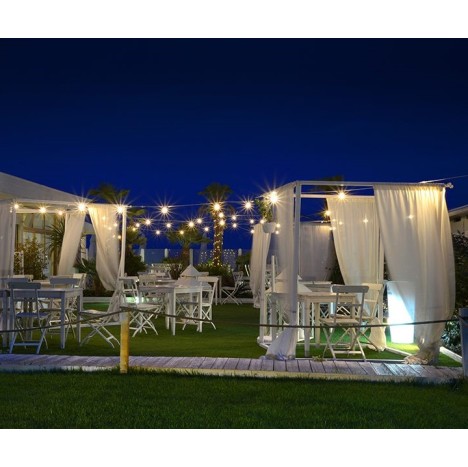 LA CATENARIA BRINDISI DELLA LINEA IMPERIA HA LA LUNGHEZZA DI 10 METRI CON 10 PORTALAMPADE E27 , IL CAVO HVV-F 2*0.75 MM², E' COLLEGABILE IN FILA CONTINUA CON CONNETTORE IP65 PER FILA CONTINUA E PRESA SCHUKO IP44. LAMPADINE NON INCLUSE.