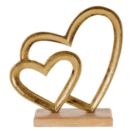 LA LINEA EGLO LIVING DECORATION PROPONE TOMAMAE UNA BELLISSIMA DECORAZIONE DA DISPORRE ALL ' INTERNO DELLE ABITAZIONI CON UN DESIGN ROMANTICO E MINIMALISTA GRAZIE ALLA SUA PARTICOLARE FORMA INTRECCIATA DI DUE CUORI DI DIMENSIONI DIFFERENTI , INTERAMENTE REALIZZATI A MANO IN ALLUMINIO DALLA COLORAZIONE ORO , QUEST ' ULTIMI SI APPOGGIANO SU UNA BELLISSIMA STRUTTURA REALIZZATA IN LEGNO DI MANGO . SI PRESENTA CON LE SEGUENTI DIMENSIONI : L 21, 5 CM x H 22 CM.